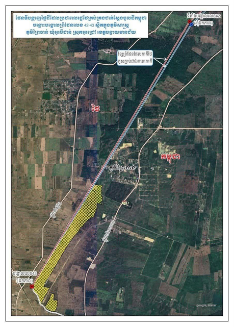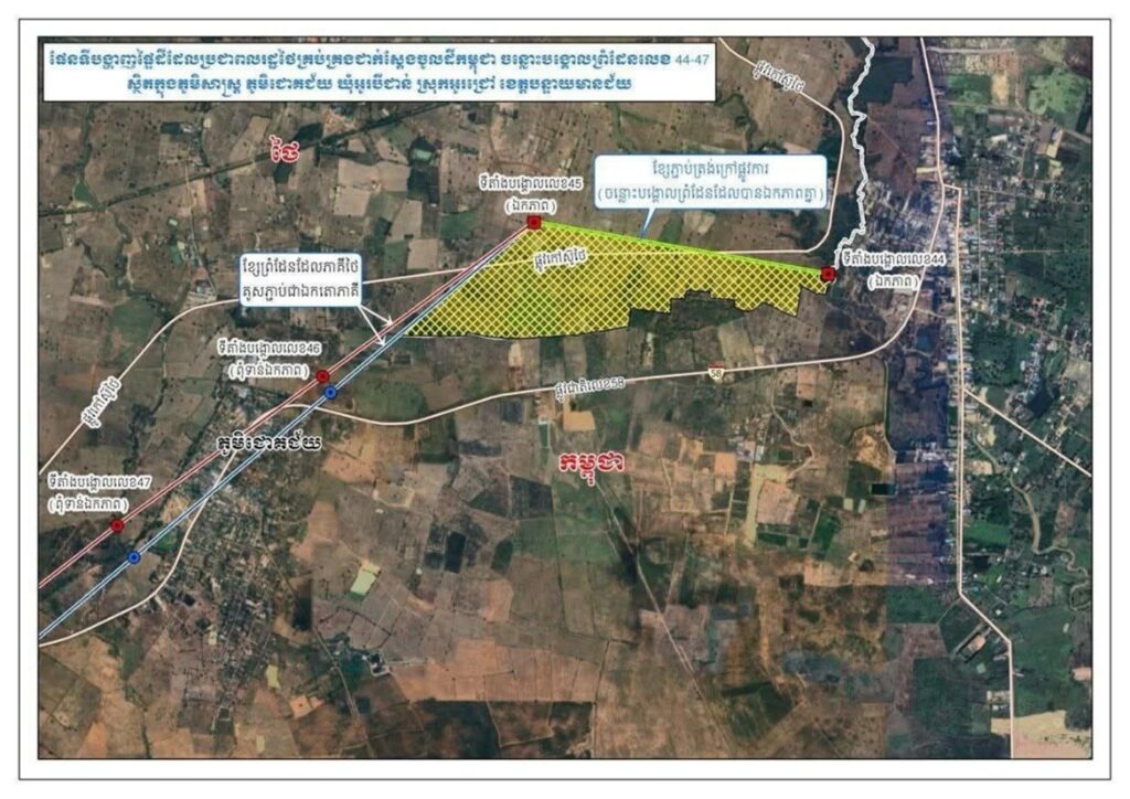 (Source: Samdech Hun Manet, Facebook post, 23 October 2025, explaining progress following the Joint Boundary Commission (JBC) meeting of 21–22 October 2025 and attaching technical survey maps relating to the Joak Chey and Prey Chan villages (between Boundary Pillars No. 42–47).