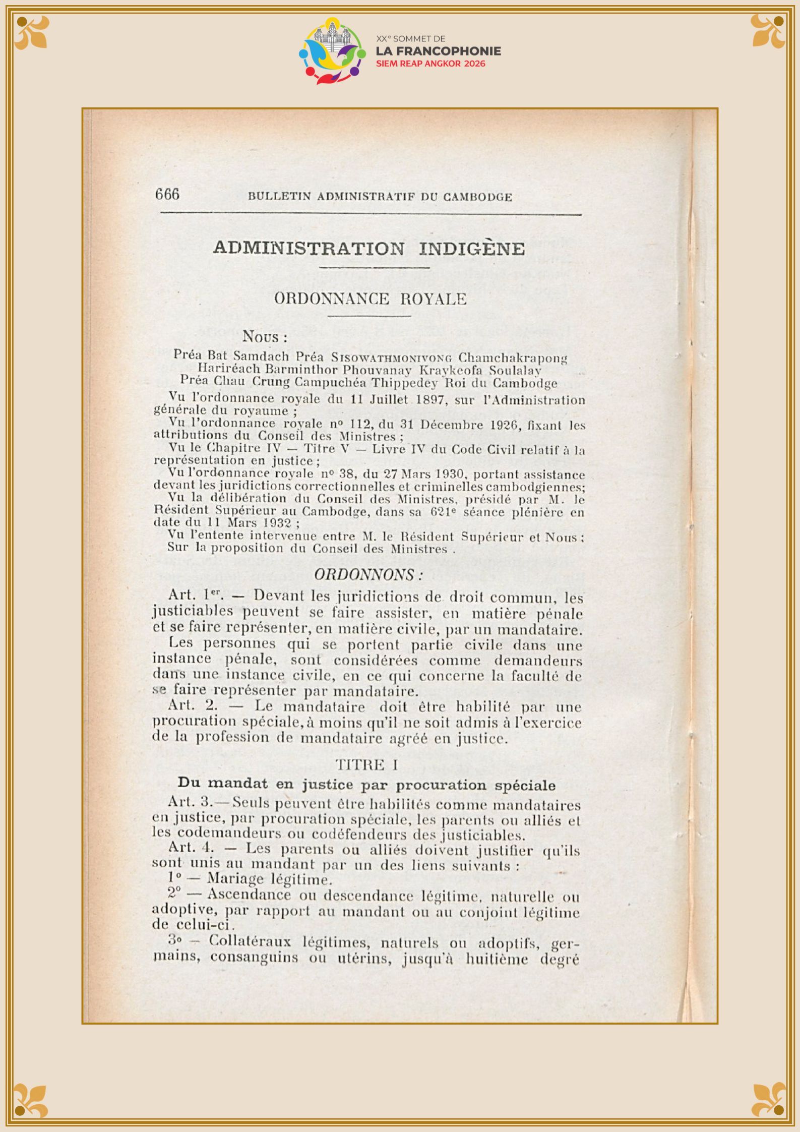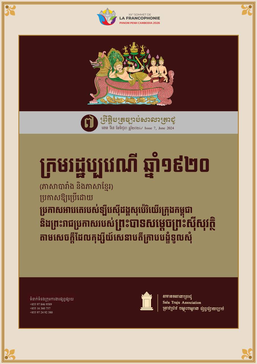 អបអរសាទរកិច្ចប្រជុំកំពូលហ្វ្រង់កូហ្វូនីលើកទី២០ ឆ្នាំ២០២៦———————————សមាគមសាលាត្រាជូ​ មានកិត្តិយសសូមនាំមកជូននូវ «ក្រមរដ្ឋប្បវេណី ឆ្នាំ១៩២០» ជាភាសាបារាំង និងភាសាខ្មែរ លើផ្នែកពាក់ព័ន្ធនឹង «កាតព្វកិច្ច» ដើម្បីឱ្យសាធារណជនទាំងអស់បានជ្រួតជ្រាបអំពីមរតកបណ្ណសារជាតិគតិយុត្តខ្មែរដែលទទួលឥទ្ធិពលពីបារាំង។ [...]