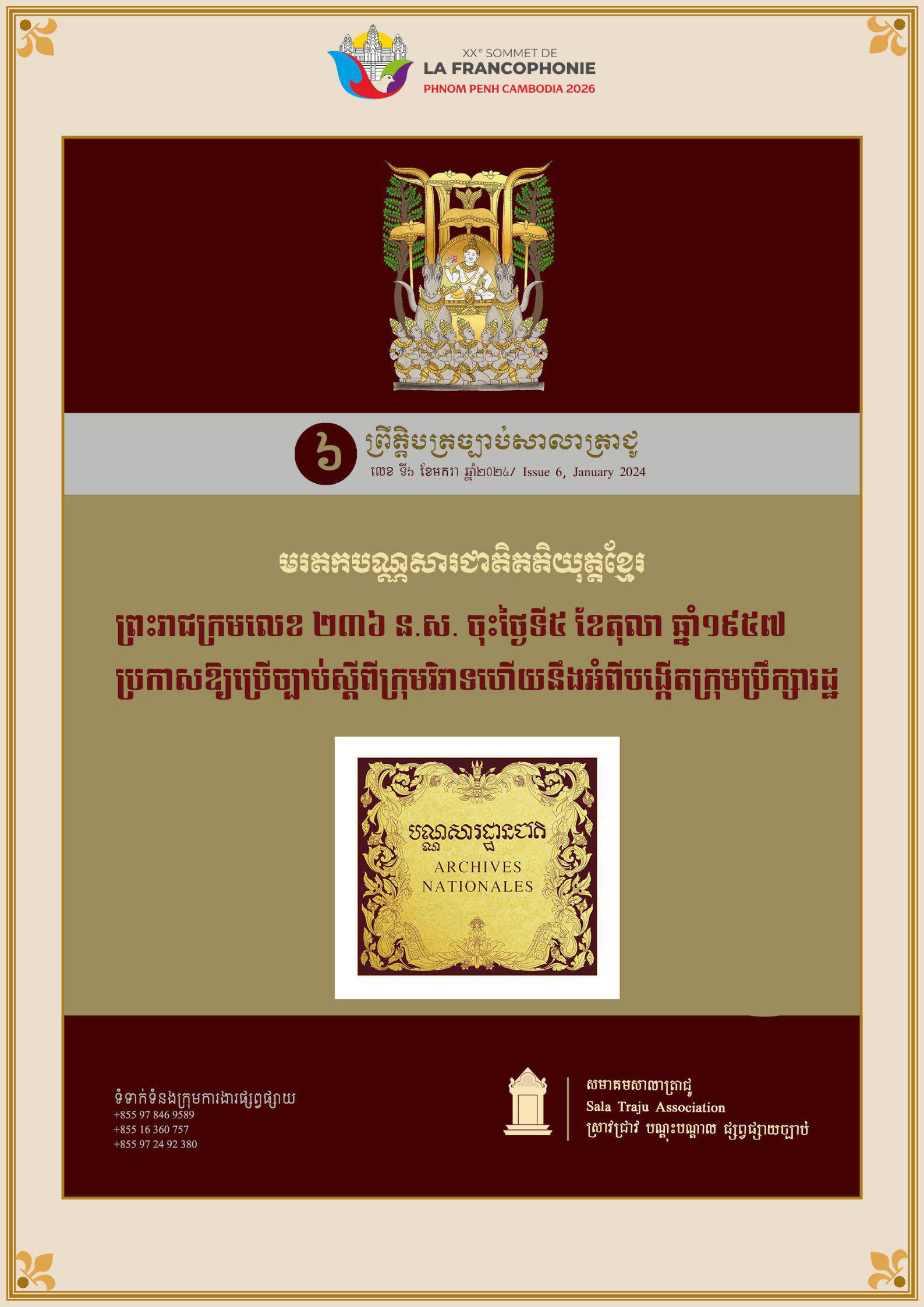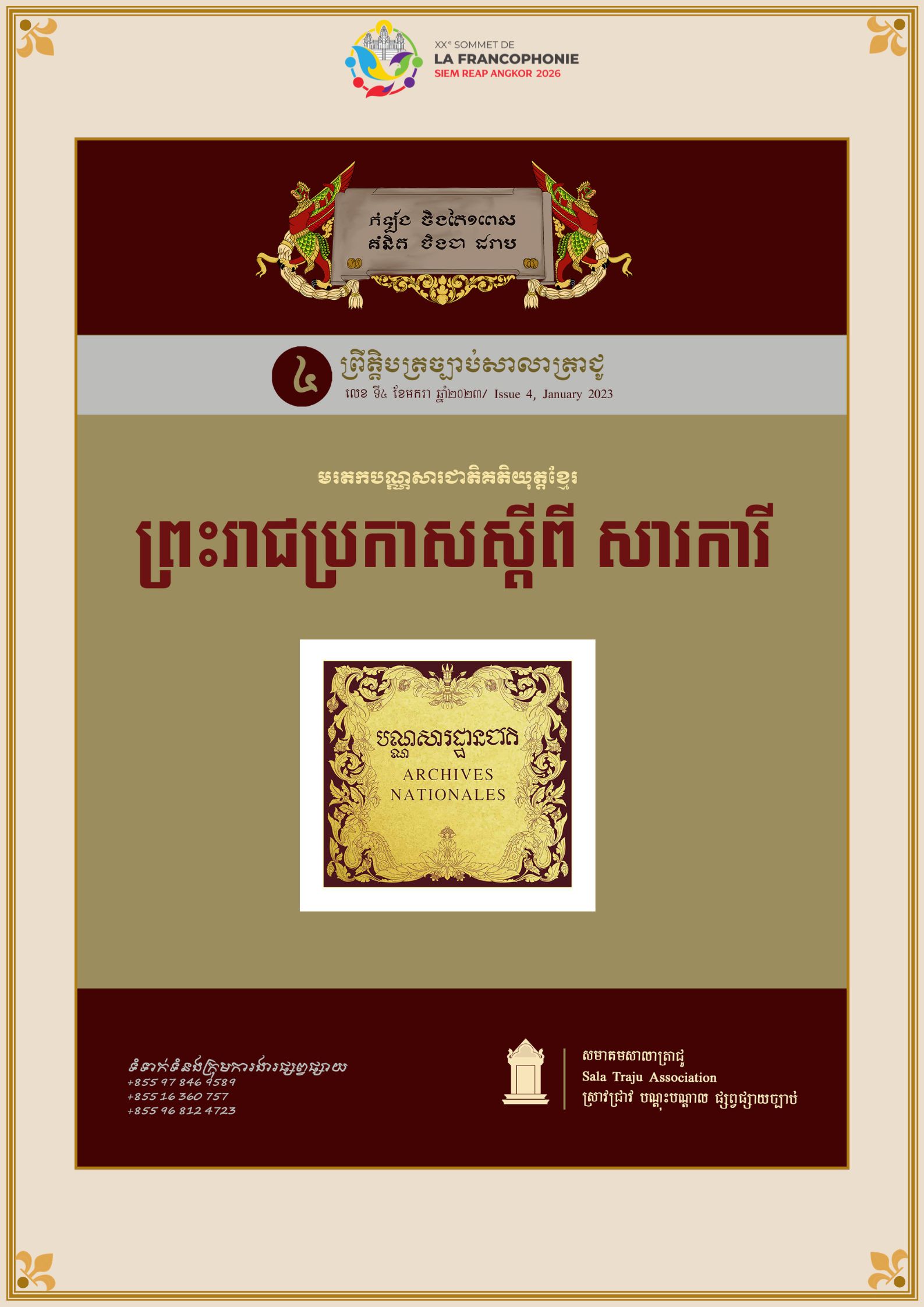 អបអរសាទរកិច្ចប្រជុំកំពូលហ្វ្រង់កូហ្វូនីលើកទី២០ ឆ្នាំ២០២៦———————————សមាគមសាលាត្រាជូ​ មានកិត្តិយសសូមនាំមកនូវ «មរតកឯកសារបន្សល់ទុកពីសម័យបារាំង» ដែលសមាគមសាលាត្រាជូបានបោះផ្សាយ និងចងក្រងនាពេលកន្លងមក ក្នុងឱកាសដែលប្រទេសកម្ពុជានឹងទទួលជាម្ចាស់ផ្ទះរៀបចំកិច្ចប្រជុំកំពូលរបស់អង្គការអន្តរជាតិនៃបណ្ដាប្រទេសនិយាយភាសាបារាំង (OIF) នៅខែវិច្ឆិកា ឆ្នាំ២០២៦ [...]