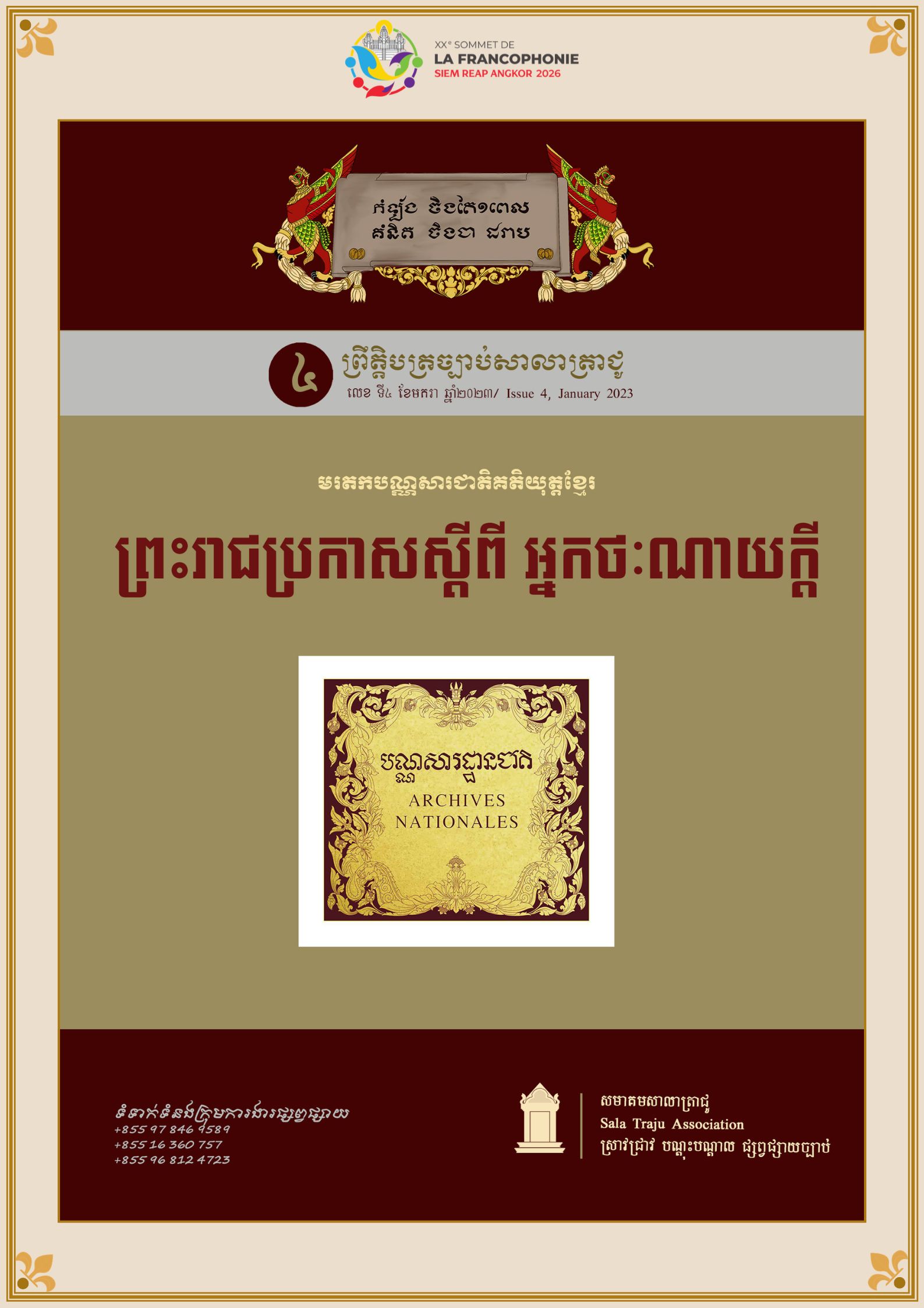 សមាគមសាលាត្រាជូ​ មានកិត្តិយសសូមជូននូវ «មរតកឯកសារបន្សល់ទុកពីសម័យបារាំង» ដែលសមាគមសាលាត្រាជូបានបោះផ្សាយ និងចងក្រងនាពេលកន្លងមក ក្នុងឱកាសដែលប្រទេសកម្ពុជានឹងទទួលជាម្ចាស់ផ្ទះរៀបចំកិច្ចប្រជុំកំពូលរបស់អង្គការអន្តរជាតិនៃបណ្ដាប្រទេសនិយាយភាសាបារាំង (OIF) នៅខែវិច្ឆិកា ឆ្នាំ២០២៦ នាពេលខាងមុខ។ [...]