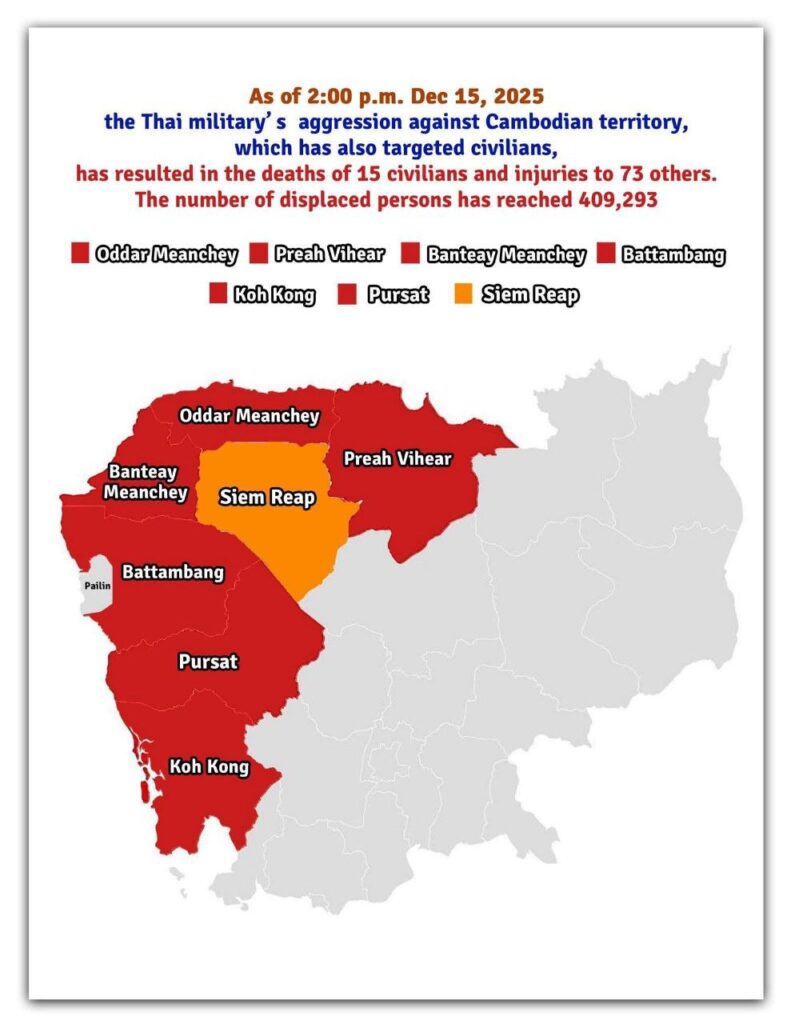 Furthermore, on December 15, 2025, Cambodia’s Ministry of Defence stated that Thai F-16 jets dropped bombs near a refugee camp in Siem Reap province, an area far from the immediate border and home to civilians displaced by months of fighting. Cambodian officials said the strikes endangered displaced people and damaged civilian infrastructure. Khmer Times reported that the attack occurred close to shelters for internally displaced families, compounding an already severe humanitarian situation.
