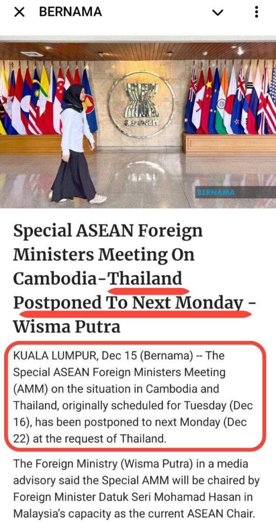 Fourth, Thailand has delayed regional diplomatic engagement. A special meeting of Southeast Asian foreign ministers, where senior diplomats from both sides could have met—was scheduled earlier this month but was postponed to 22 December at Thailand’s request, according to Malaysia’s foreign ministry.⁴ At a moment of heightened tension, delaying a regional forum designed for dialogue is not neutral. It is a choice to defer negotiation when it is most needed.