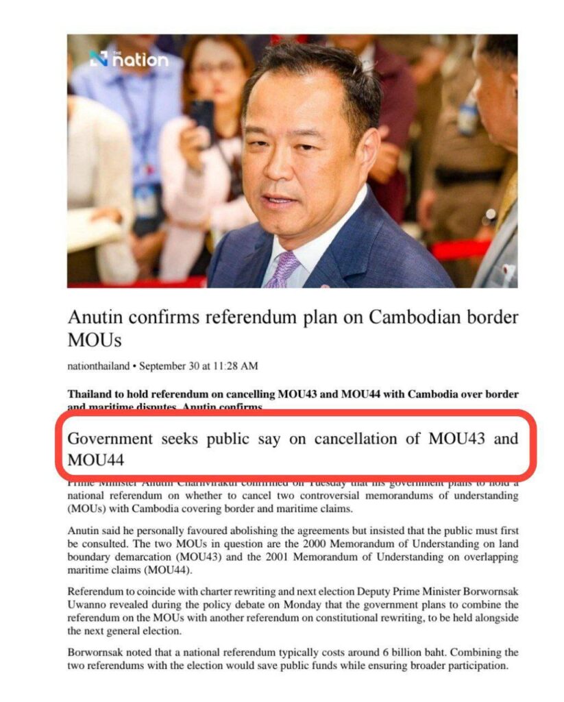 - The Nation (Thailand), “Anutin Confirms Referendum Plan on Cambodian Border MOUs,” September 29, 2025.