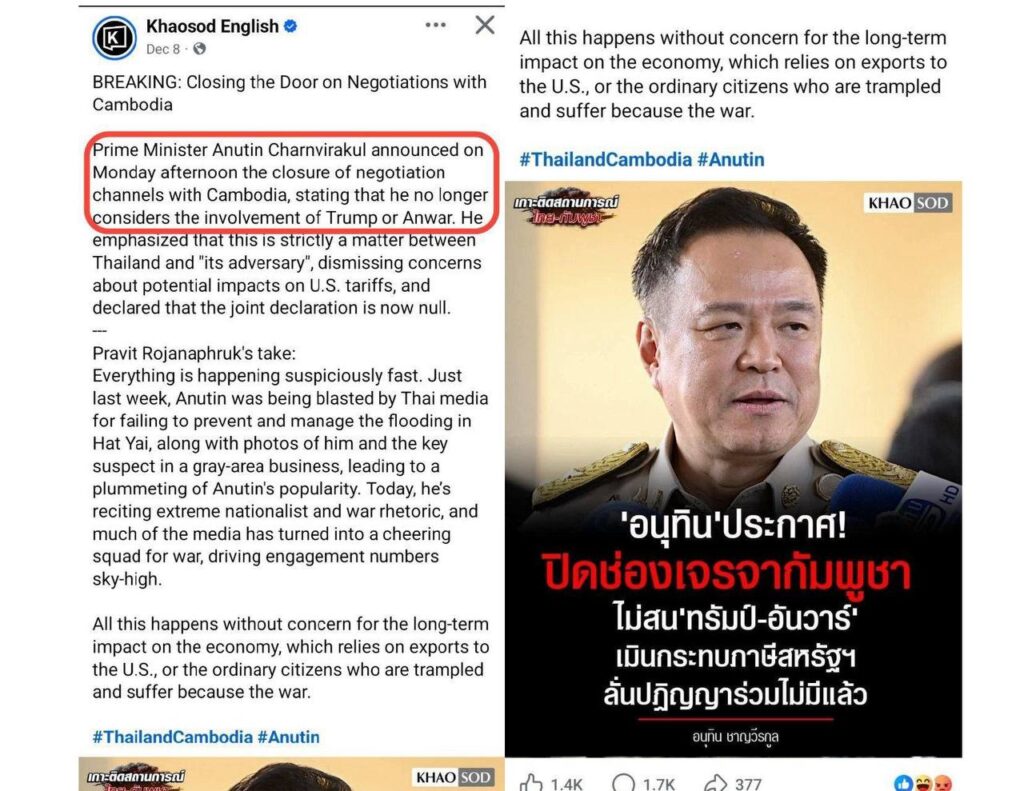 - Khaosod English, “Closing the Door on Negotiations with Cambodia,” statement by Prime Minister Anutin Charnvirakul, 8 December 2025.