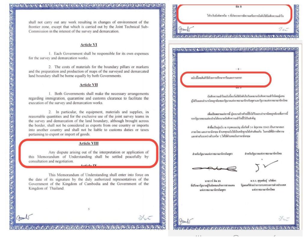 First, Thailand has moved to dismantle the legal architecture that makes negotiation unavoidable. Between September and October 2025, the Thai government has signaled its intention to cancel the 2000 Memorandum of Understanding on land boundary demarcation through a national referendum.¹ This agreement does not award territory to either side. What it does is bind both parties to consultation and negotiation. Article VIII of the MOU is explicit: disputes “shall be settled peacefully by consultation and negotiation.”