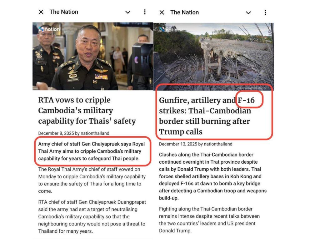 Third, December 2025, Thailand’s military posture has escalated in both tone and substance. Senior figures in the Royal Thai Army have publicly stated that their objective is to “cripple Cambodia’s military capability for years” to ensure Thailand’s security.³ This is not the language of containment or deterrence. It signals a long-term strategy aimed at degrading a neighboring state’s capacity. The deployment of advanced military assets, including F-16 fighter jets, further underscores that this is not spontaneous self-defence but coordinated planning.