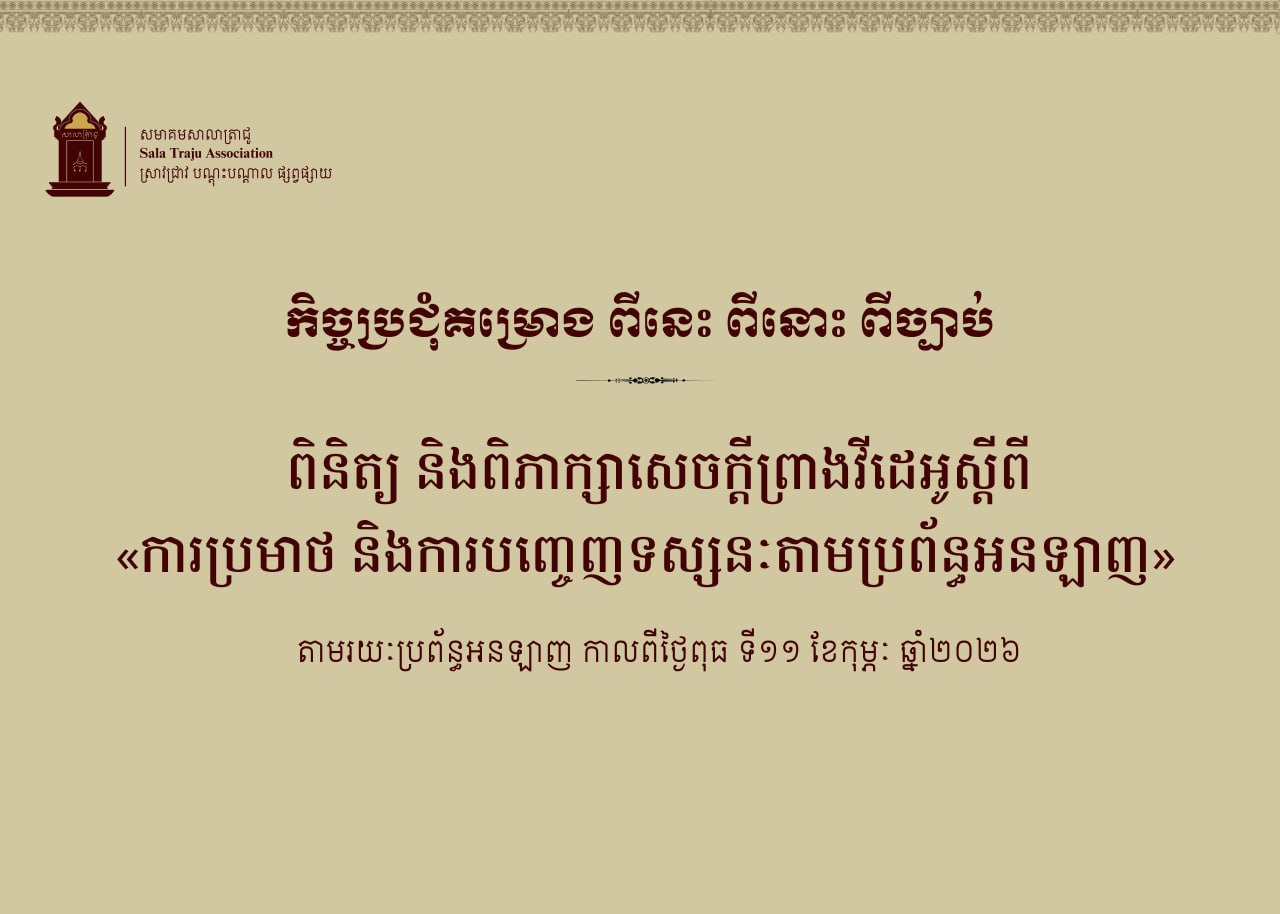 គណៈកម្មការចំពោះកិច្ចទទួលបន្ទុកគម្រោងពីនេះ ពីនោះ ពីច្បាប់របស់សមាគម សាលាត្រាជូ បានរៀបចំកិច្ចប្រជុំ «ការពិនិត្យ និងពិភាក្សាសេចក្តីព្រាងវីដេអូស្តីពី «ការប្រមាថ និងការបញ្ចេញទស្សនៈតាមប្រព័ន្ធអនឡាញ» [...]
