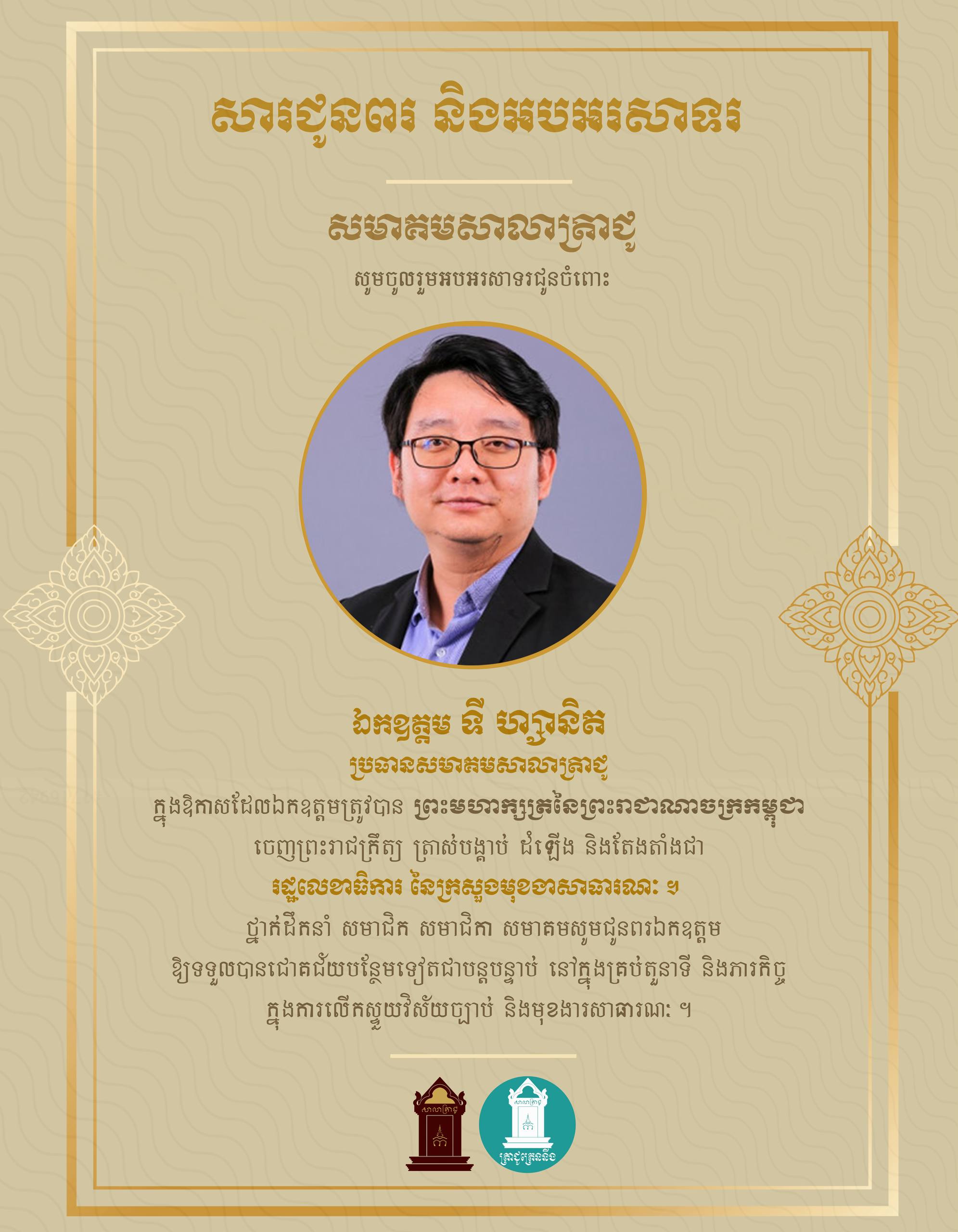 សមាគមសាលាត្រាជូ សូមចូលរួមអបអរសាទរគោរពជូនចំពោះឯកឧត្ដម ទី ហ្សានិត ប្រធានសមាគមសាលាត្រាជូ ក្នុងឱកាសដែលឯកឧត្តមត្រូវបានព្រះមហាក្សត្រនៃព្រះរាជាណាចក្រកម្ពុជាចេញព្រះរាជក្រឹត្យ ត្រាស់បង្គាប់ ដំឡើង និងតែងតាំងជារដ្ឋលេខាធិការ នៃក្រសួងមុខងារសាធារណៈ [...]